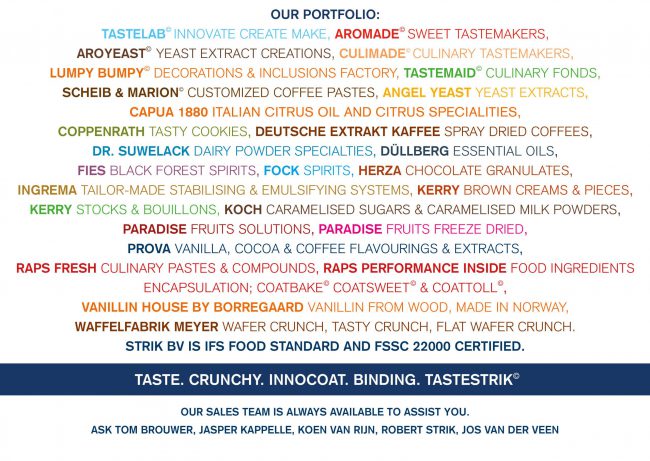 It’s up to you when the coat comes off… It’s innoCoat®, de standaard voor encapsuleren van voedingsingrediënten. Gecoate voedingsingrediënten bieden ongekende mogelijkheden voor productontwikkeling, kwaliteits- en procesverbetering. In nauwe samenwerking met u en Raps Performance Inside biedt TasteStrik pasklare oplossingen, sedert 1990.